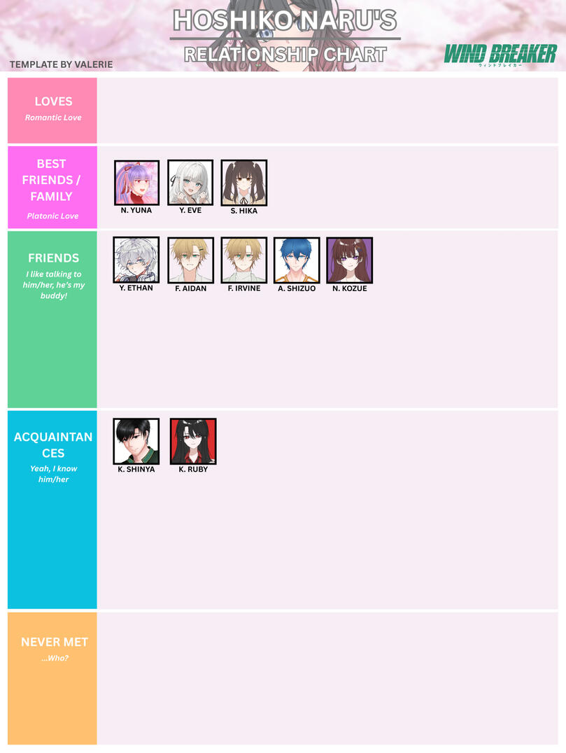 Naru, ya? Dia sedikit mirip Irvine karena hobi mereka sama. Terus dia agak pemalu juga sepertinya, atau itu hanya padaku saja, ya? HAHAHA—Maaf kalau aku pernah membuatnu enggak nyaman, Naru. Anyways, you suit Hayato even in a single glance, so... have a longlasting love!About Naru from Irvine :